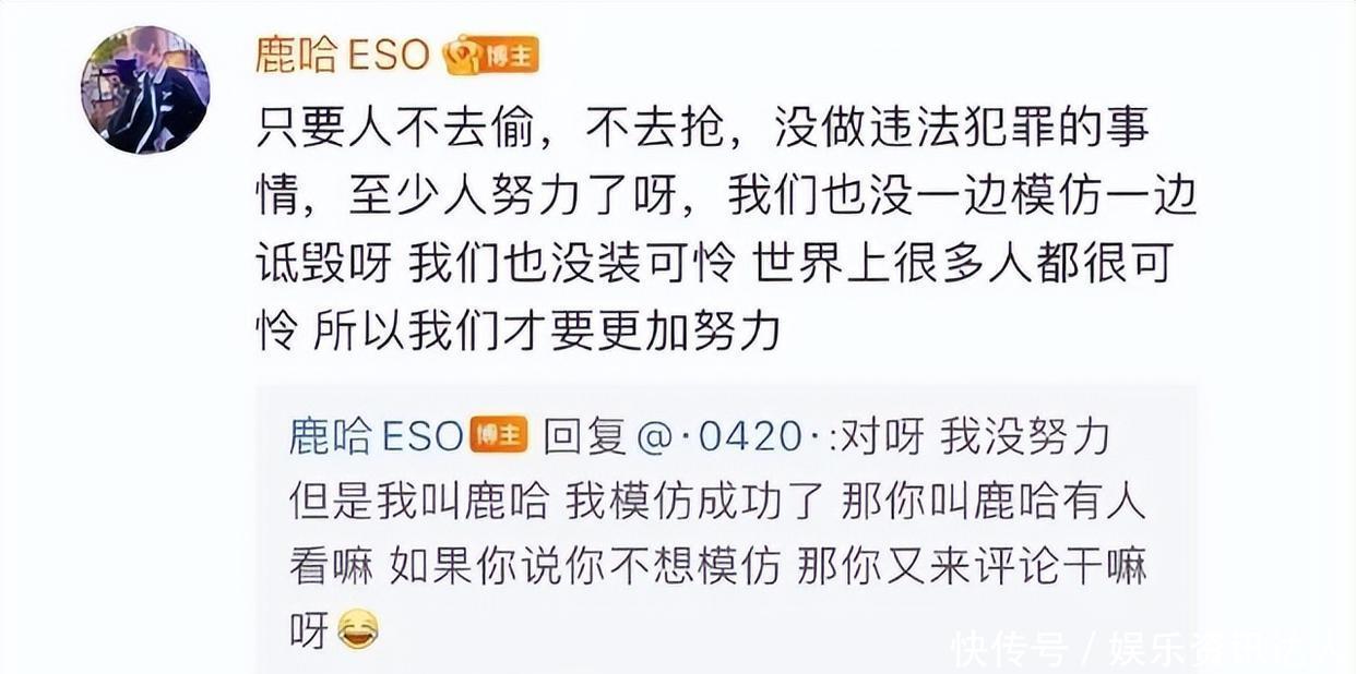 鹿哈自己倒是不避讳,曾在视频里回应说“模仿不觉得丢人”。